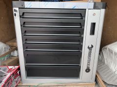 Rozsdamentes acél szerszámosláda fémcsatokkal. A szortimenter kialakítása lehetővé teszi kisebb elemek tárolását.
